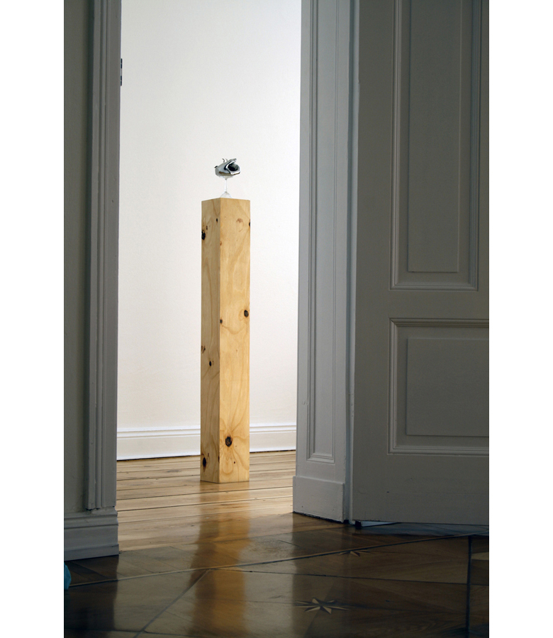 chromed plaster cast, stuffed bird, crystal glass,pine stand, sand